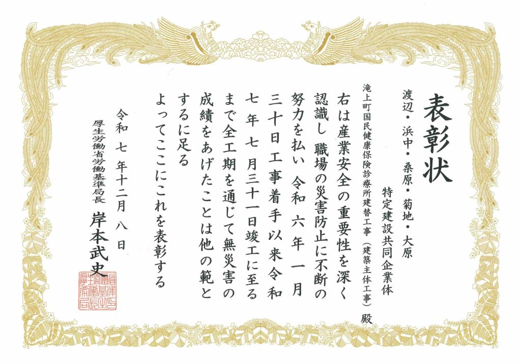 滝上町国民健康保険診療所建替工事において、全工期に渡って無事故無災害を達成し、厚生労働省から「建設無災害表彰」を受賞することができました。