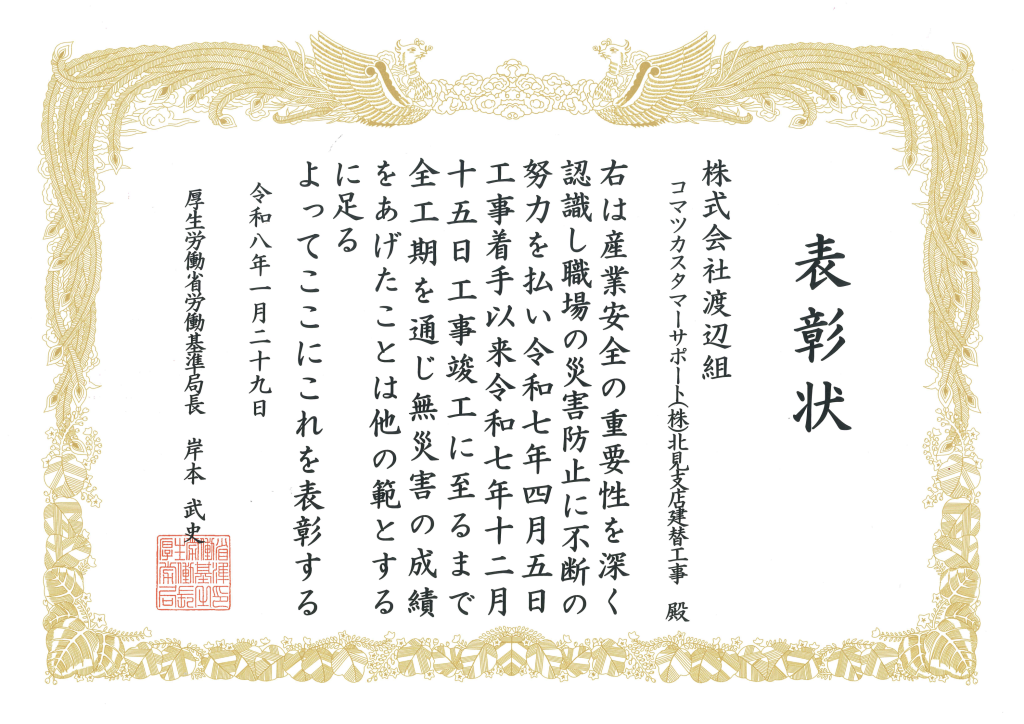 コマツカスタマーサポート(株)北見支店建替工事において、全工期に渡って無事故無災害を達成し、厚生労働省から「建設無災害表彰」を受賞することができました。