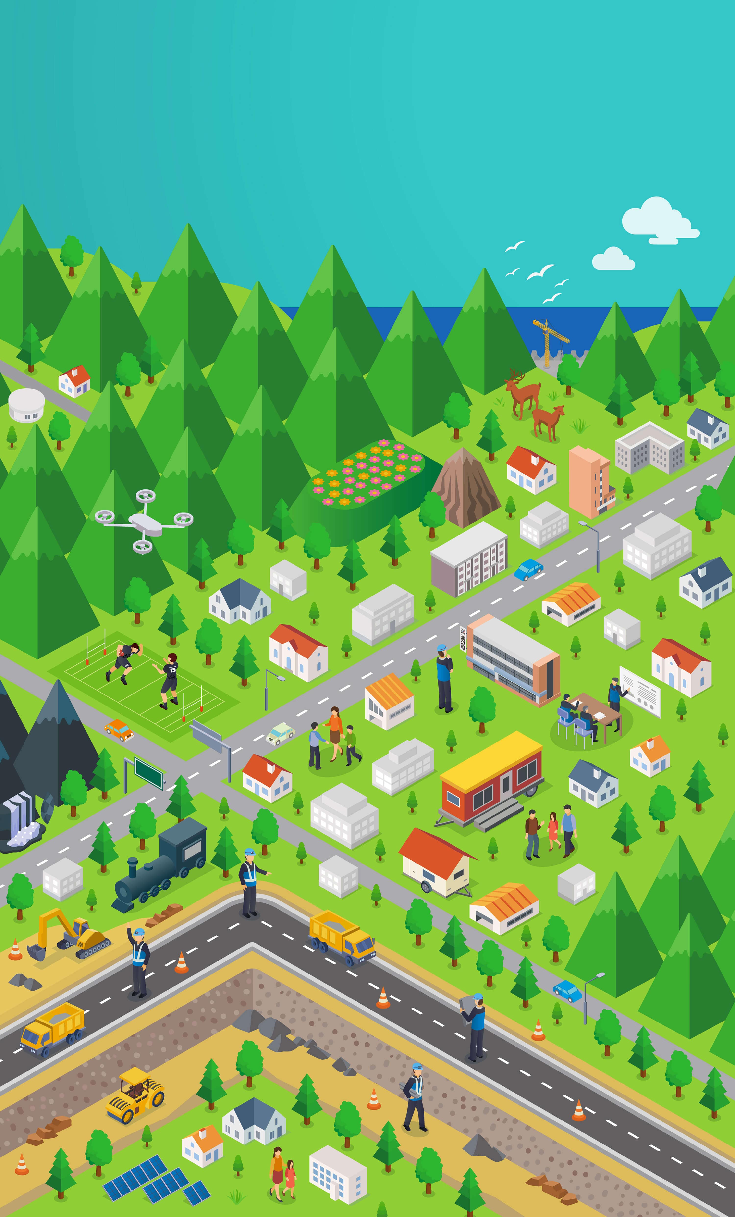 道路や橋などインフラの建設・整備を行います。新設工事から既存インフラの改修や更新工事など、地域の人々の生活基盤を支える仕事です。また、昨今はICT(情報通信技術)を活用した施工技術で品質・安全性の向上に努めています。